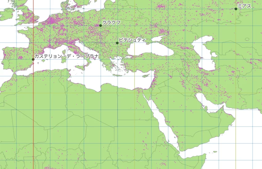 このあいだ地図を扱う仕事をしていたところ、「ニューオーリンズは緯度経度が凄い」ということに気づいた。北緯30°、西経90°、大変キリが良い。 何かの話のタネにはなるかもしれないが、もっと凄いところがあるぞというツッコミを頂いてしまっては悔しい。そんな思いつきと好奇心で、緯度軽度が5の倍数の格子点にある、そこそこの規模の都市を探してみることにする。 Natural Earthから都市データをダウンロードしてQGISにつっこんでみる。“urban area” という、人口集中地域を線で囲んだデータレイヤーがある